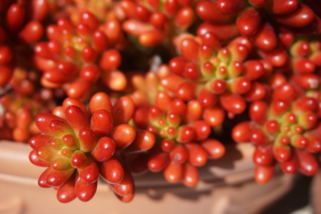 様々な種類がある「セダム」の中でもつやつやのジェリービーンズのような葉を持つ「オーロラ」。人気の園芸品種にも「虹の玉」「レッドルビー」などがあります。0℃以下になると枯れる恐れがあるので霜よけは必須。もっと耐寒性が欲しければ、ここまで色付きませんが「乙女心」という品種なら、‐9℃まで可能です。
