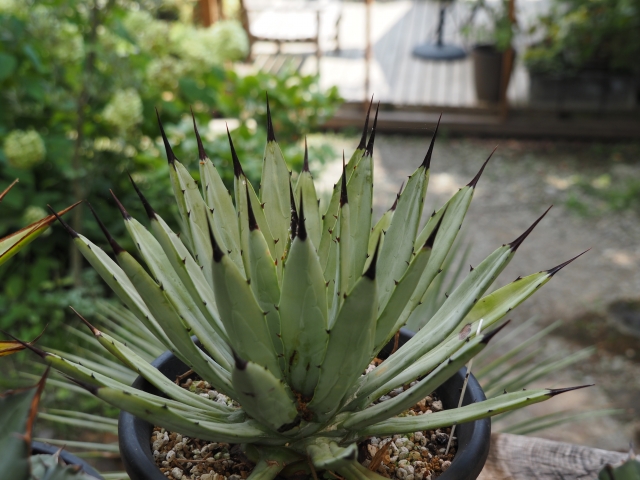 アガベ・マクロアカンサは、肉厚でシルバーかかった細めの葉っぱが放射線状に広がり、先端にある黒いトゲがクールで男性的な印象です。種類が豊富で、葉が長いもの、短いもの、葉の色幅などに違いがあります。別名、Dwarf Black-spined Agave(スピンアガベ)。マクロアカンサ・ベルデという品種が人気です。