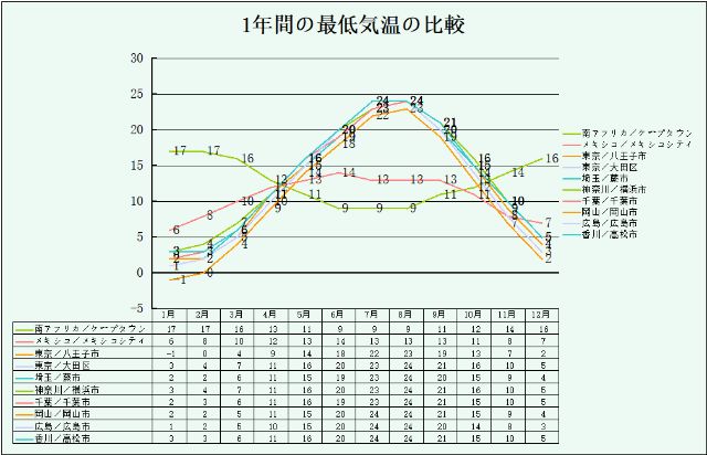 ドライガーデンの砂地に「多肉植物」が植わっていたら、カッコいいですよね。しかし、多肉植物の原産地はメキシコや南アフリカであり、日本とは気候が違います。1年間の最低気温を見てみましょう。岡山市の1月、2月の最低気温はグラフでは2℃になってますが寒波が来ると-2℃くらいになることはある中、メキシコでは6℃、南アフリカでは9℃ほどなのです。多肉は基本的に「寒さに弱い植物」と理解しましょう。見た目がカッコいいからという理由だけで選んでしまうと、あとで大変なことになってしまいます。