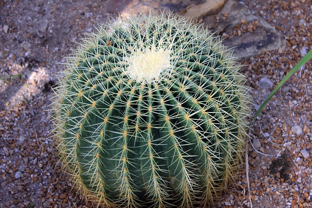 ゴールデンバレルカクタスは「金鯱(キンシャチ)」と呼ばれる玉サボテンの代表的な種類です。黄金色の鋭いトゲが特徴で、SNS映えするルックスなのでぜひ利用したいところですが霜には弱いので、最低気温が5度を下回り、強い霜が降りそうな地域では、最初から室内での管理を想定して、鉢植えにしてドライガーデンに配置する工夫をするとよいでしょう。