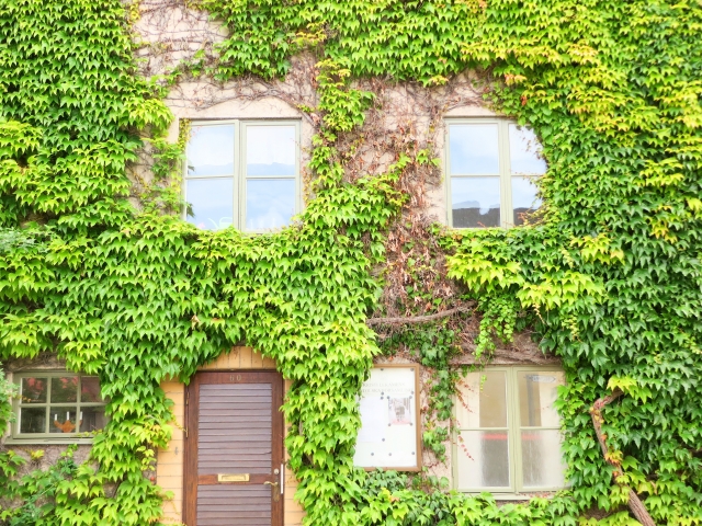 アイビーなどのつたが絡んだ洋館は、パッと見は素敵ですが、一番やってはいけないガーデニング例です。寄せ植えなどに入っていたつたが、いつの間にか独立して壁を伝って増え、なんとなく素敵な雰囲気なので、そのままにしてしまいがちですが、この事実を知っている人からは「早く取りなさい」と怒られるかもしれません。