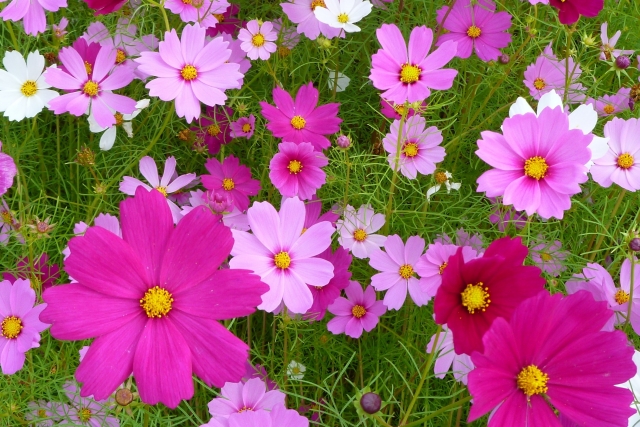 イングリッシュガーデン(ボーダーガーデン)は、奥側に背の高いもの、手前に小さいものを植えるのがセオリーです。奥側にはフェンスや壁があると思いますので、背の高い宿根草や、倒れやすいコスモス、穂を上げるグラス類はフェンスに固定するなどして立たせるとよいでしょう。