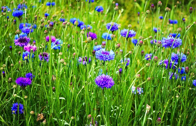 ・解説:ヤグルマギクは別名コーンフラワーで。春から夏に咲くキク科の一年草です。種まきでよく育つので、ワイルドフラワーミックス種子の中には必ずと言っていいほど入っています。すらりと1mほどに伸びますが、花の輪は小さく直径2~3cmです。色は涼し気な青紫の他に、白やピンク、紫、渋い黒系の花もあります。