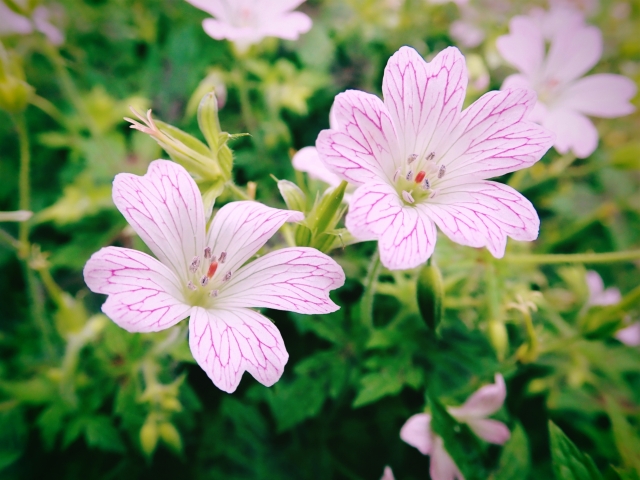 ・解説:ゲラニウムは、青や白、ピンク、紫、褐色など様々な花色があり、かわいらしい小さな花を咲かせます。ゲラニウムには草丈30㎝以下の高山性(背の低いタイプ)と草丈50cmほどになる高性の種類があります。高山性のゲラニウムは寒冷地でないと育たないので、関東以西の暖地のガーデンでは高性のタイプを使用します。明るい半日陰で、水はけと水持ち両方叶った用土に植え付けるとうまく育ちます。