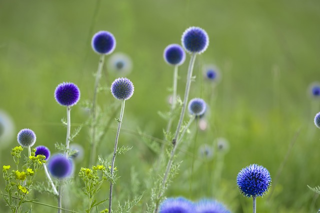 ・解説:ハリネズミと言う意味の学名を持つルリタマアザミは、鮮やかな瑠璃色のトゲトゲした球状の花を咲かせる宿根草です。その美しさから、切り花やドライフラワーの花材としても活躍しています。日本の九州にもヒゴタイと言うルリタマアザミの一種が自生しています。