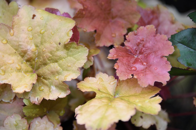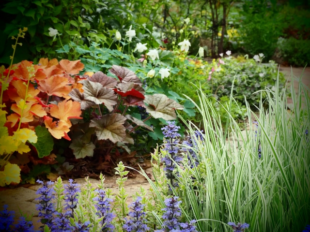 ・解説:ヒューケラは別名ツボサンゴ。昔は緑の葉で赤い花が咲くものが主でしたが、今ではキャラメル色や赤茶色の葉、斑入りのものなど、様々な葉色の品種が市販されるようになり、アートのように楽しむことができます。日陰でもよく育ちます。