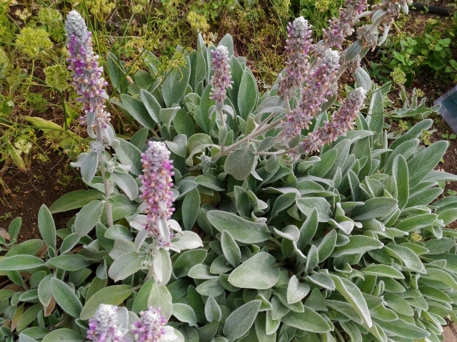 ・解説:ふわふわの白い毛に覆われた柔らかい葉を持つラムズイヤーは、ひつじの耳のような葉を持つことから名付けられました。初夏に紫色の花穂を上げます。大変丈夫なのですが、葉っぱ自体は地に伏せているので蒸れやすく、時々枯葉を取り除くときれいに保てます。