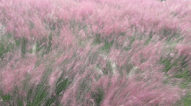 ・解説:ミューレンベルギア・カピラリスは、ピンク色の穂を持つ園芸種です。ホワイトクラウドという白色品種もあります。日の光に透けるとキラキラ輝き、晩秋からの枯れた花穂も美しく、ウィンターガーデンを飾ります。