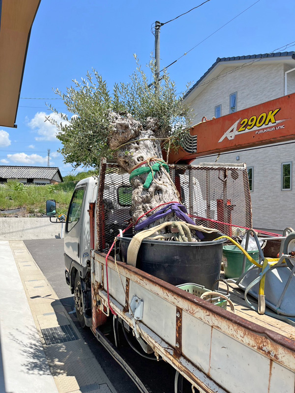 古木オリーブの到着!樹齢は優に100年は超える貴重な1本。ゴツゴツした幹は厳(いか)つさや迫力が魅力ではありますが、葉は優しく風になびくと清々しさも感じられ、もはや神々しさを感じる古木オリーブ。