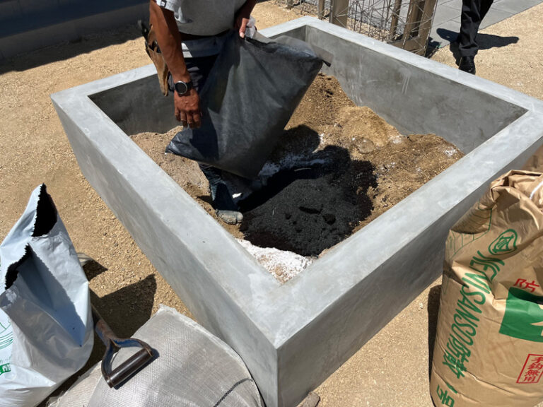 植え込みの前に土を作ります。基本的にオリーブは乾燥を好む樹種のため、パーライト、くん炭、堆肥などを混ぜながら水はけがよい土を作りました。