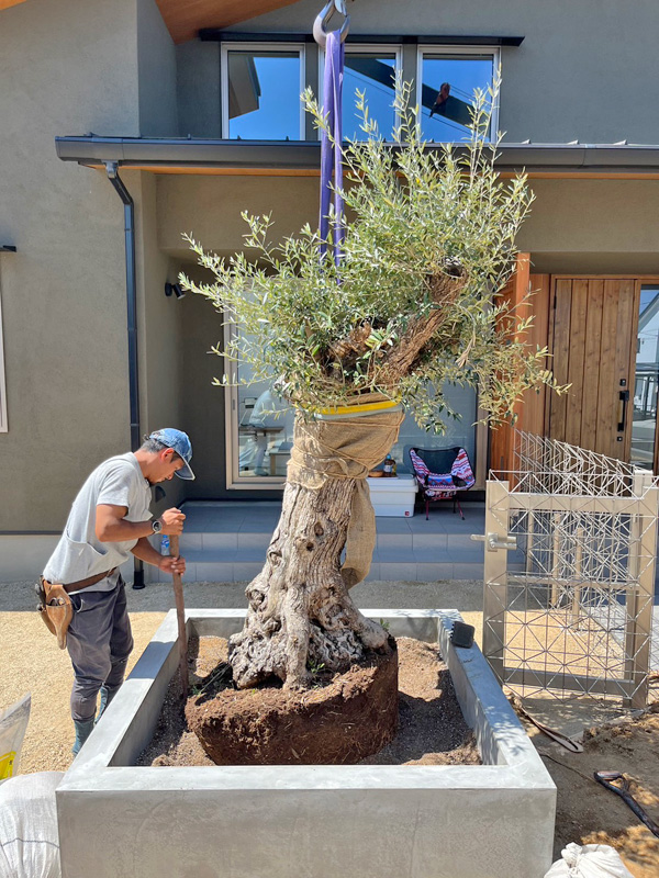 施主様と相談しながら古木オリーブの向きを決めていきます